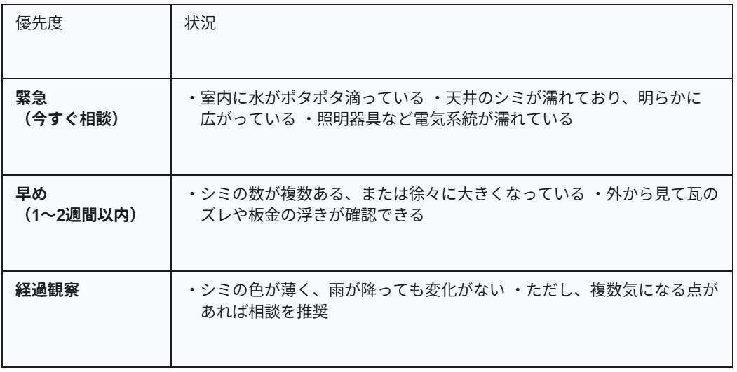 ご自宅の状況に合わせて、相談の緊急度を判断しましょう。