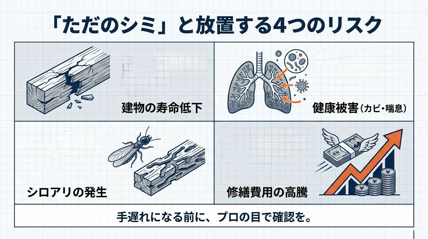 小さなシミでも、その裏では深刻な問題が進行しているかもしれません。放置することで、以下のようなリスクに発展する恐れがあります。