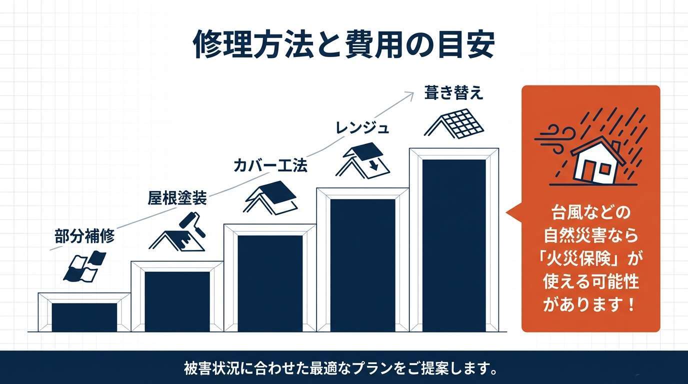 修理費用は被害状況や屋根の種類、足場の有無によって大きく変動します。あくまで一般的な目安として参考にしてください。(※戸建て30坪程度の場合)