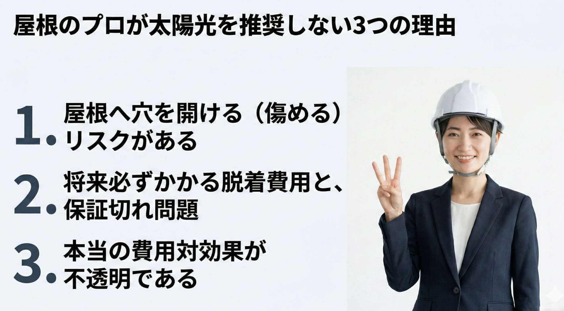 正直にお伝えすると、太陽光発電には電気代削減などのメリットがある一方で、屋根側から見ると決して無視できない「リスク」が存在します。