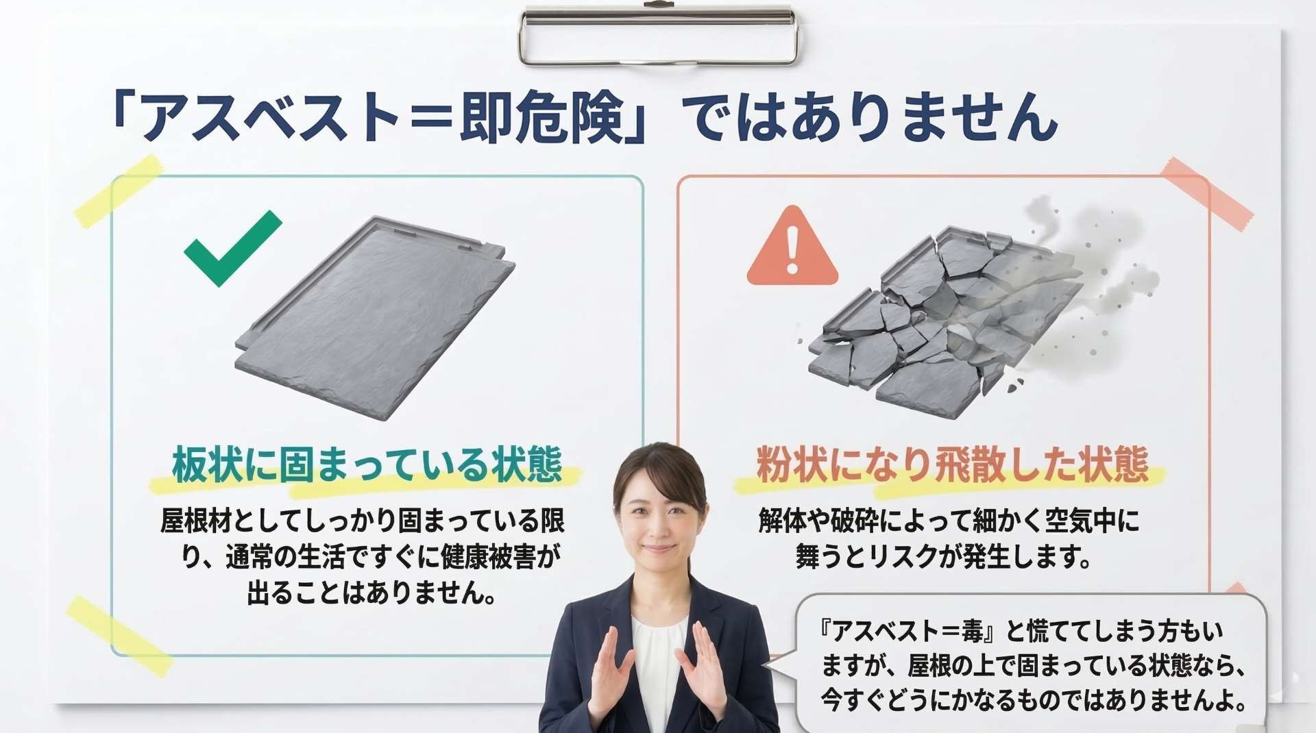 「アスベスト」という言葉に怖いイメージを持つ方も多いですが、屋根材としてセメントで板状に固められている状態(成形板)であれば、乗っているだけで飛散して健康被害が出ることはまずありません。